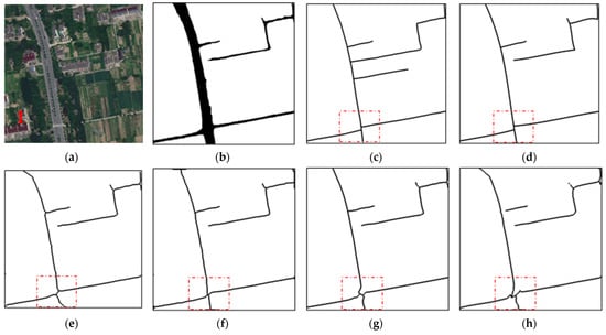 Until now, a variety of road centerline extraction methods have been proposed from different viewpoints. In general, there are two kinds of methods for road centerline extraction. One is tracking road centerlines directly from remote sensing images. For example, Zhou et al. [2] introduced a road tracking system based on human–computer interactions and Bayesian filtering. Cheng et al. [3] proposed using a parallel particle filter to track road centerlines. Dal Poz et al. [4] presented a methodology which extracts road seeds first with local road property and then links them among road seeds. The other is the most widely utilized, which segments road areas from images first, and then detects the final centerlines. Based on this framework, road centerlines are generally extracted using one of the following: (1) traditional thinning algorithms, such as morphology thinning [1,5,6]; (2) tensor voting [7,8,9]; (3) non-maximum suppression (NMS) [8,10,11]; and (4) convolutional neural networks (CNN) [12]. Moreover, Negri et al. [13] realized the road skeleton extraction using an incremental tracking approach from SAR images. Among these methods, traditional thinning algorithms have a quick response, but may result in small spurs or loops instead of neat curves when segmented roads have no regular shapes. For tensor voting, it is time consuming, and an extra connection step to fill gaps is needed. NMS algorithms retain local maximum positions as centerlines, as it largely depends on the computation of the centerline response map. CNN is a highly effective supervision method which requires a large amount of sample data. In practical applications, time cost is often a considerable factor. Moreover, the accuracy of road junctions is of high importance when constructing road network topologies; therefore, as for road centerline extraction from remote sensing images, there is room for further research.