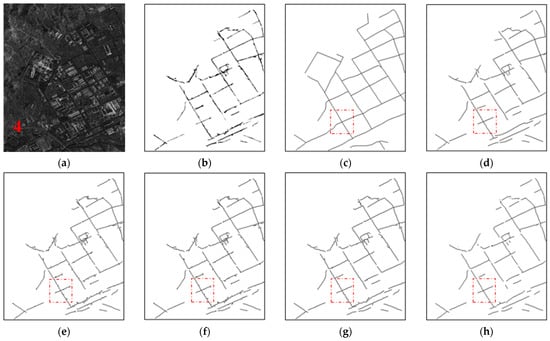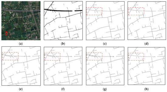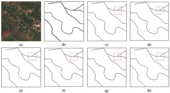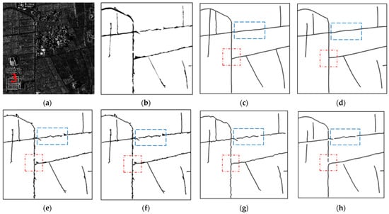 Experimental results for test image 6. (a) Original optical image. (b) Labelled road map. (c) Reference centerline map. (d) Result of the proposed method. (e) Result of the MT method. (f) Result of the ZST method. (g) Result of the MARS method. (h) Result of the NMS method.