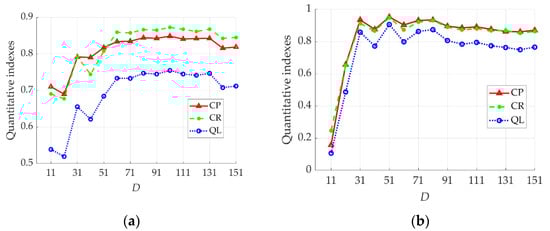 The quantitative indexes (CP, CR, QL) versus the diameter of the sliding window. (a) Results for test image 2. (b) Results for test image 6.