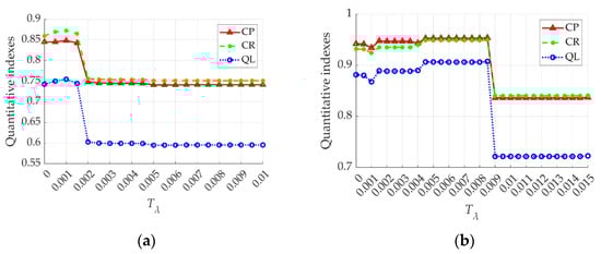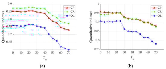 The quantitative indexes (CP, CR, QL) versus the threshold in the experiments. (a) Results for test image 2. (b) Results for test image 6.