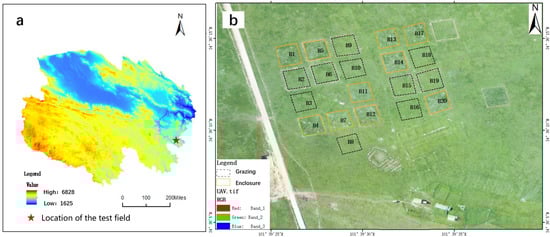Overview of the study area. (a) Digital elevation model (DEM) map of Qinghai Province, China, where the study area is located. (b) A drone view of the test site. Image bands are red, green, and blue. Ten of the sample plots were enclosed, while the other ten were allowed to be freely grazed.