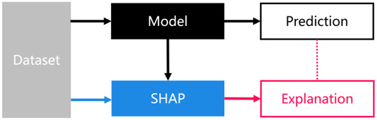The Shapley value was first proposed by Lloyd Shapley—a professor at University of California, Los Angeles [79]. Its initial research objective was to help solve the problems of social contribution and the distribution of economic benefits in the process of economic cooperation or a game. For example, if there are N people cooperating, due to their different abilities, each member’s contribution will be different, and the distribution of benefits will be different. The optimal distribution is as follows: individual contribution is equal to individual benefit. The Shapley method quantifies the contribution rate and profit distribution. The Shapley value refers to the amount of money those individual members earn on a project equal to their own contribution level. The Shapley Additive Explanations (SHAP) package is a model interpretation package developed in Python that can be used to interpret the output of any machine learning model [80]. The model interpretation method based on the Shapley value is a post-model interpretation method independent of the model. As shown in Figure 3, the process of model prediction and SHAP interpretation are two parallel processes, and SHAP interprets the results of model prediction. Its main principle is as follows: the SHAP value of a variable is the average marginal contribution of this variable to all special sequences. SHAP constructs an additive explanatory model inspired by cooperative game theory, in which all variables are regarded as “contributors”.