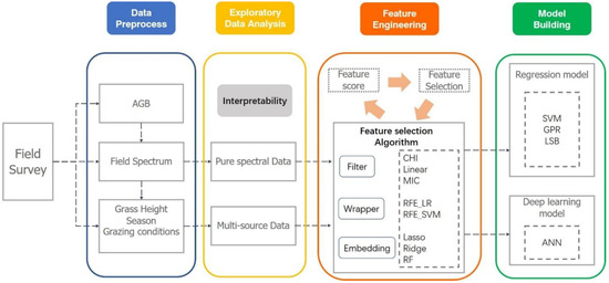 Based on these findings, there are few studies on systematic feature selection for the hyperspectral interpretation of alpine grassland with complex and diversified populations, and the use of interpretable machine learning in alpine grassland hyperspectral research is rarely reported. As a result, in this study, we investigated an alpine grassland experimental site in Henan County, Qinghai Province, where a fence closure experiment was designed to (i) measure the canopy spectra and ecological parameters of each typical community and carry out a statistical analysis, (ii) analyze and compare the results of different feature selection algorithms, (iii) establish an AGB estimation model using support vector machine, Gaussian process regression, least squares regression boosting, and artificial neural network, and (iv) build machine learning interpretable models to analyze the results. Overall, this study introduces a novel analytical modeling approach for monitoring above-ground biomass on the Tibetan Plateau using hyperspectral remote sensing.