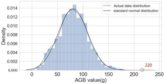The AGB of all 1200 samples was used to create a histogram (Figure 5); the data were found to be almost normally distributed, indicating that there were sufficient data points used in the experiment. The AGB of one sample was anomalously large (220 g), which made the right tail of the histogram longer; however, the difference was not significant. These findings are consistent with the expected behavior of natural grassland—that is, the biomass is concentrated in a range, and the proportion of large values is very small.