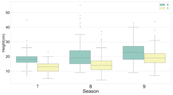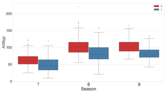 Box plots showing statistical analysis of AGB and grass height by month (7 = July, 8 = August, 9 = September). Numbers 0 and 1 indicate not grazed and grazed.