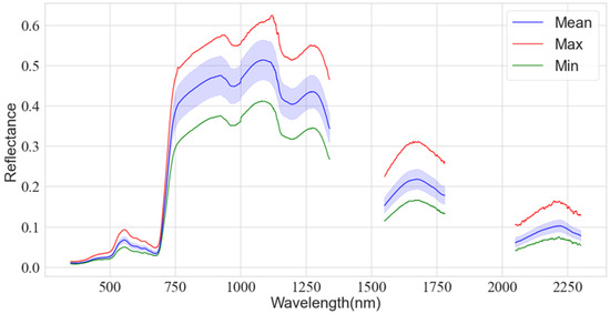 Field measured spectral curves. The Max line is the highest reflectivity hyperspectral. The Min line is the lowest reflectivity hyperspectral curve. The Mean line shows the mean and variance of the spectrum.