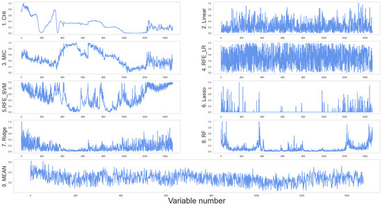 The spectral data were processed using several feature selection methods to determine the score of each band (minimum 0 and maximum 1), the results of which are displayed in Figure 9. The details of the individual curves are as follows. (1) The overall Cor curve is reasonably smooth; the neighboring band scores are close to each other without discarding redundancy between variables, allowing the band intervals to be identified with high correlation. (2) The linear scoring may quantify the linear relationship between spectra and AGB; however, it also singles out the correlation characteristics of all relevant features—i.e., numerous higher score values emerge surrounding each individual high score. For example, high scores near variable 200 are densely distributed, and the wide bar chart contains several adjacent bands. (3) The MIC and CHI curves are generally similar, showing linear relationships between the independent and response variables as well as nonlinear ones. The MIC curve, however, does locally show a major excursion compared to Cor. (4) The RFE_LR curve is based on linear regression model optimization, which is more prone to bipolar evaluation overall; however, the distribution of high and low scores is relatively uniform, and the feature selection performance is poor. (5) The RFE_SVM scores show considerable unpredictability and volatility, with visible valleys and a broad distribution of peaks. (6) The Lasso approach can successfully select a limited number of critical feature variables while allowing the scores of the majority of other features to converge to zero. It is particularly useful when the number of features needs to be reduced; however, it is not very effective when trying to interpret data. (7) The Ridge approach scores each linked variable equally, as shown in Figure 9, and the scores of close bands are extremely similar. (8) After assigning a few characteristics with the highest ratings, the RF approach scores the other factors considerably lower. (9) Overall, when all of the features are averaged, most of the variables have values between 0.1 and 0.5.