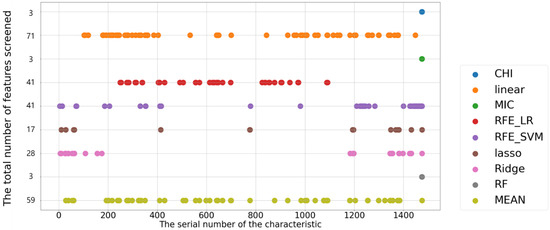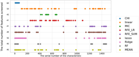 The Chi-square test (CHI), a filtering method, is used to capture the linear relationship between each feature and the label [56]. By calculating the Chi-square statistic between each non-negative feature and the label, the features are ranked from highest to lowest according to the Chi-square statistic. The Chi-square statistic is a measure of the difference between the distribution of the index data and the chosen expected or assumed distribution. It was proposed by the British statistician Pearson in 1900. It is obtained by dividing the square of the difference between the actual observation times () and the theoretical distribution times () by the theoretical times and then summating them. Its calculation formula is as follows: