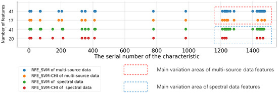 Each spectral parameter is given a score by the feature selection algorithm: the greater the score, the more important the parameter is. The top-ranking feature parameters are then chosen as the final parameters. The feature selection analysis was carried out on both the pure spectral and multi-source data.