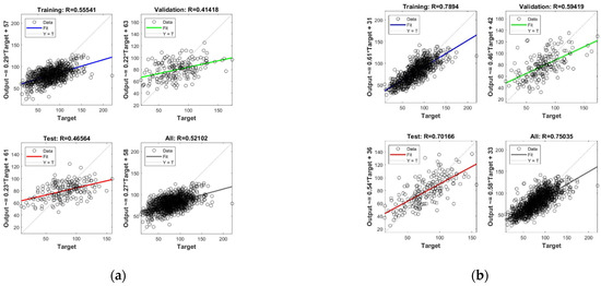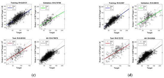 The coefficient of determination (R2) and root mean square error (RMSE) were used as accuracy evaluation methods. Higher R2 values suggest more accurate modeling. The RMSE measures the model’s predictive capacity, and its magnitude is inversely proportional to the model’s accuracy.