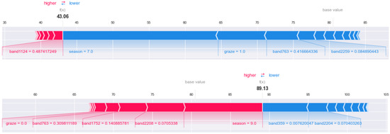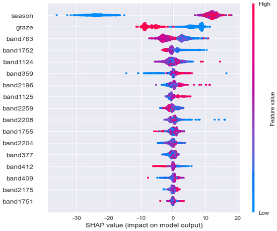 A range of results from hyperspectral studies of alpine grassland biomass has been obtained, providing a solid and reliable theoretical foundation for this type of study [42,43]. However, these studies use empirical analysis models, as the vegetation composition, structure, and natural conditions of different study sites are not consistent; there is thus also inconsistency in the data, models, and algorithms from different approaches, preventing the direct comparison and evaluation of their results [44]. This issue can be addressed by applying the concept of data mining to establish a standardized and normalized data analysis process, improve the modeling approach to fully explore the spectral information, and strictly control the analysis process to optimize the modeling results to ensure the validity and accuracy of the machine learning inversion model [45]. Regardless of the accuracy of their outputs, machine learning (ML) models are sometimes criticized as being “black boxes” whose internal logic is difficult for humans to understand [46]. Thus, a well-established maximum likelihood model can unfortunately only produce prediction results without providing significant insights—a problem known as interpretability [47]. Using interpretable tools to identify the relative importance of the input variables and how they interact with the output variables is one approach to resolving this challenge [48]. By merging some of the field survey data, in this study, we performed a spectral inversion model interpretability analysis and compared the results to develop a spectral–ecological variables–AGB mechanistic model with better physiological interpretability.