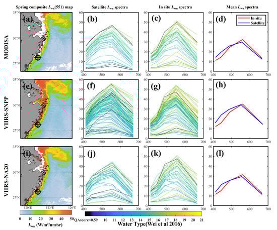 Figure 3d,h,l. These matchup comparisons indicate that a general spectral concordance exists between satellite and in situ data. However, in the average