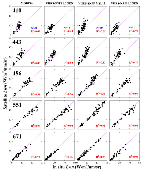 R2 can be found in MODISA, VIIRS-SNPP L2GEN, and VIIRS-NA20 L2GEN comparisons. This degradation in the correlation for 410 nm and 443 nm agrees with more recent findings from the Long Island Sound coasts, USA, which was considered to have originated from the data processing procedure [