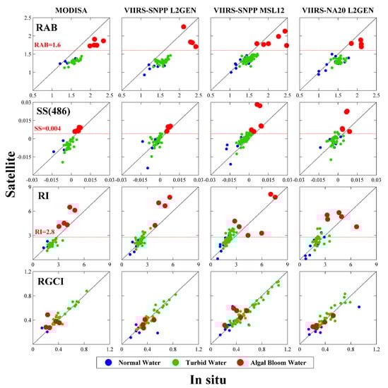 −1. General consistency between satellite data and the SeaPRISM data can be found for all the four indices, but a difference exists in the capacity of the separation of bloom waters from normal ones. However, for sediment-dominated waters, the optical properties in the red bands were determined by both phytoplankton and sediment, and thus the separation of bloom areas from turbid waters by RGCI was not satisfactory. Although the performance of RI and SS(486) seems to be better, the separation in the two methods makes both not clear enough, probably because the blue band of 443 nm with relative high uncertainties was used in both of them. Thus, it can be clearly found that the RAB method probably yielded the best discrimination and the threshold value of 1.6 seems suitable for both MODIS and VIIRS for the identification of algal blooms. This success can be attributed not only to good quality of 488 nm and 551 nm data (