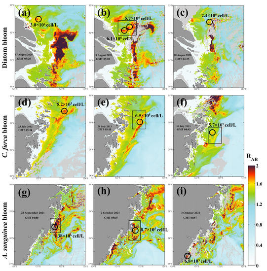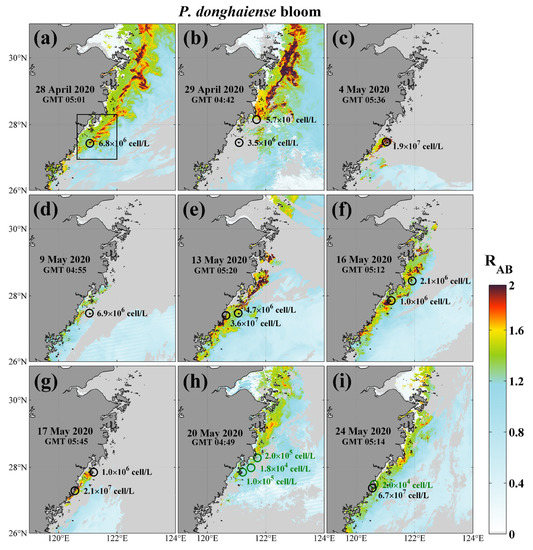 Figure 8d,e,g–i, respectively. Although there is an hourly error in the matchups of VIIRS derived RAB data and field surveys, these results are still sufficient to confirm the ability of VIIRS to detect HABs in the ECS.