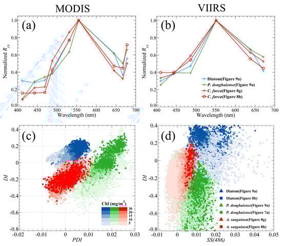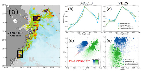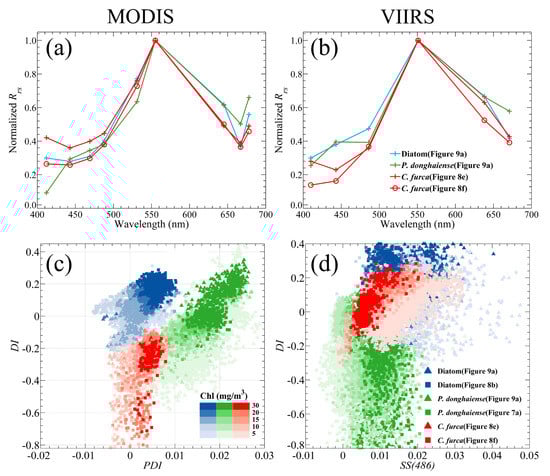P. donghaiense and diatoms; nevertheless, owing to the presence of the DI index, a clear trend still exists that can be used to separate the two types of blooms. Although VIIRS still has the ability to distinguish between