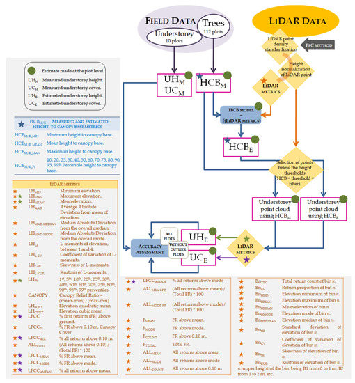 Workflow of the methodology steps. Green dot—estimates made at plot level; blue star—estimated and measured HCB filters; orange star—LiDAR metrics calculated with the complete point cloud and used in the HCB estimated filters modelling; green star—LiDAR metrics, calculated on the filtered point cloud, used to evaluate UH; purple star: LiDAR metrics, calculated on the filtered point cloud, used to assess the UC.