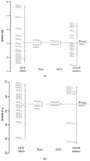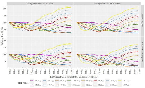 In general, for HCBM-i and HCBE-i filters, the metrics appraised present two types of behaviour: (i) if HCB filters ϵ (HCBMIN, HCBP10, HCBP20, HCBP25, HCBP30), Figure 4 shows an inverse relationship between relative RMSE and LiDAR metrics, i.e., the relative RMSE decreases as the percentile of LiDAR metric increases and (ii) if HCB filters ϵ (HCB40, HCBP50, HCBMEAN, HCBP60, HCBP70, HCBP75, HCBP80, HCBP90, HCBP95, HCBP99, HCBMAX), Figure 4 shows an inverse and direct relationship between relative RMSE and LiDAR metrics, where LHMEAN metric is the inflection point. Although the plots have similar ecological characteristics, the overlap of tree and shrub canopies varies among plots, which visibly influences the estimates obtained. For this reason, if we apply filters of the higher percentiles or the maximum value of HCB, submerged crowns could be kept, and the understorey measurements overestimated. On the contrary, when filters of the lower percentiles or the minimum value of HCB are applied, returns belonging to the larger bushes may be eliminated and underestimate the measurements, excluding returns that remain between the filter made and the actual crown base height. For the metric 10th percentile, all the HCB filters have a relative RMSE close to 100%. So, the metric LHP10 is the least sensitive to the establishment of height thresholds. From this metric to the metric LHP60 (along the x-axis in Figure 4), their sensitivity in the face of HCB filter variations is very similar. However, it increases considerably until it reaches its maximum value using LHMAX. This metric is the most sensitive to variations in the HCB filter. In the last case, the use of the HCBP25 filter shows a relative RMSE that ranges from 25% to 75% (using estimated HCB filters—without outlier plots and using estimated HCB filters—all plots, respectively), while the HCBMAX filter shows a relative RMSE that varies between 160% (using estimated HCB filters—without outlier plots) and 225% (using measured HCB filters—all plots).