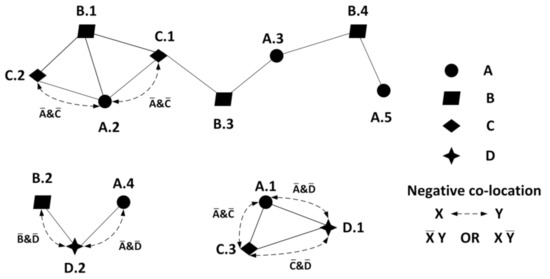 - By combining the negative co-location patterns from small to large size, two patterns in extreme cases and their meanings are proposed: a “single positive of negative co-location pattern” and a “single negative of negative co-location pattern”. Additionally, an algorithm for solving the pattern is given.