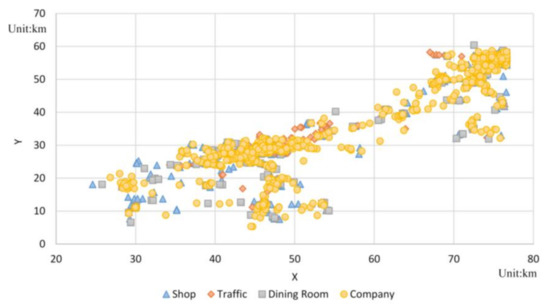 As shown in Table 3, to further validate the performance of the algorithm proposed in this paper, the real data, kindergartens, automobile services, restaurants, shops and Guilin per capita income, which include 1466 kindergartens, 1193 automobile services, 4202 restaurants and 473 shops, were used. According to the nature of the schools, kindergartens were classified into four types: public, private, public institutions and local businesses. The number of teachers and the size of the kindergarten were judged according to the number of classes and degrees in the kindergarten. In this paper, the per capita income of Guilin was divided as follows according to the “Guilin per capita disposable income from January to September 2021” issued by the Guilin Statistics Bureau of Guangxi Province. For urban personnel, a monthly income of more than 3500 RMB is rich, a monthly income of 3300~3500 RMB is medium and a monthly income of less than 3300 RMB is poor. For rural people, a monthly income of more than 1400 RMB is rich, a monthly income of 1100~1400 RMB is medium and an income of less than 1100 RMB is poor.