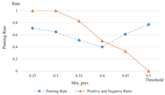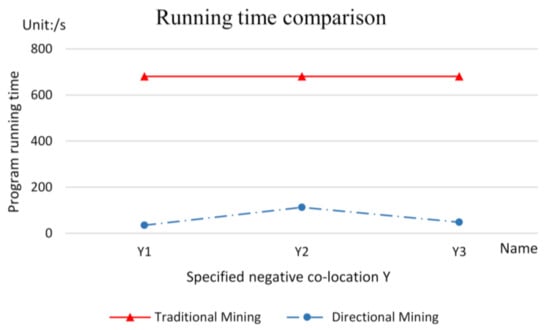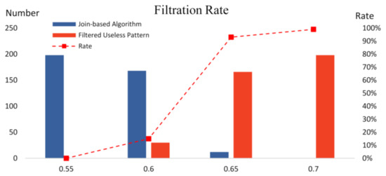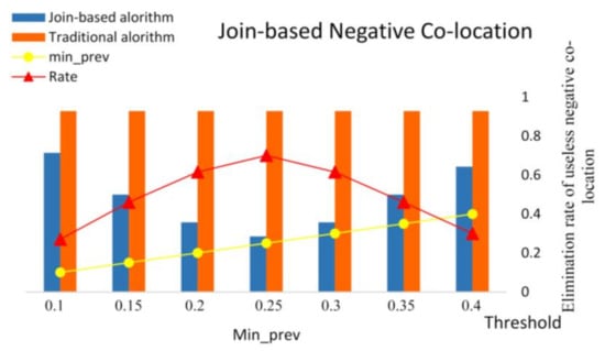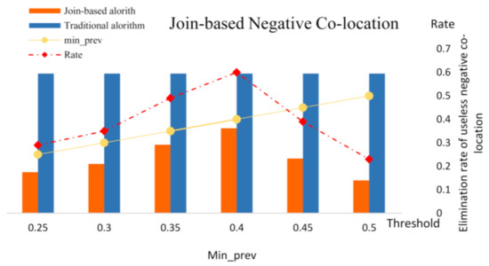 This section analyzes the performance of the algorithm. Figure 10 show the comparison between our algorithm and the traditional algorithm, in which the broken line Rate represents the elimination rate of the useless co-location in the traditional algorithm by our algorithm, and the histogram is the calculation amount of each algorithm. It can be analyzed from Figure 10 that in this experiment, the elimination rate of the algorithm in this paper increased first and then decreased with the increase of the min_prev value. It can be seen that when min_prev was 0.25, the elimination rate was the largest, which was 0.7. It can be seen from Figure 11 that in this group of experimental data, the algorithm running time decreased first and then increased with the increase of min_prev. When min_prev was 0.25, the running time was the shortest, which was 1437 s. Through the experiments in this section, it was proved once again that our algorithm is faster than the traditional algorithm [49] and reduces the operation of useless negative co-location.