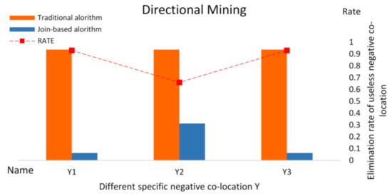 Spatial data mining with a negative co-location pattern can be significant because it can find features with strong negative correlations and determine mutually exclusive relationships between spatial features, which can play a vital role in many applications. For example, Cao et al. [39] proposed that with negative mining being applied to the detection of gene sequences, the birth of disabled babies can be effectively avoided by mining the negative co-location relationship between certain diseases and specific gene sequences. It is also possible to prevent the occurrence of diseases in advance by mining gene sequences. Zheng et al. [38] proposed an Apriori-like negative mining algorithm to mine the data of supermarket shopping baskets. He defined negative correlation as (1) ; (2) (3) . However, the algorithm was not extended to the mining of spatial negative co-location. Moreover, because a large number of useless negative mining need to be calculated, the pruning of the algorithm needs to be further improved. The two negative mining examples above discover that it must calculate a large number of useless negative co-location patterns to obtain prevalent negative co-location patterns. For this reason, this paper proposes a join-based algorithm, which avoids calculating a large number of useless co-location patterns and effectively mines prevalent negative co-location patterns. This paper also provides a directional mining algorithm. Given a specified space feature set and size number, the prevalent candidate negative co-location pattern can be quickly determined.