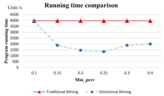 Comparison of running times between traditional mining and directional mining under different Min_prev.