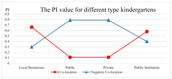 (1) The PI value for the total co-location pattern { private and public kindergarten, restaurant, shop, automobile service} is 0.11, and the PI value for the total negative co-location pattern { private and public kindergarten, , , } is 0.89. The negative co-location PI value is large, indicating that its mutual exclusion is greater than its correlation, showing that private and public kindergartens are widely distributed. In order to meet the schooling needs of most families, whether the surrounding environment of the kindergarten is prosperous is not the focus of the construction of private and public kindergartens.