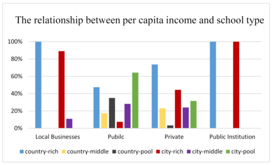 (3) The co-location PI value and negative co-location PI value for the kindergarten and the surrounding features also discover the relationship between the size of the kindergarten and the economic status of students’ families. For example, the average number of private and public kindergarten classes is 5.38, and the average number of degrees is 139.13. This shows that there are fewer teachers and students in the kindergarten, which is consistent with the high negative co-location value (negative C-LPI: 0.89). Similarly, it can be seen from Figure 13 that in the family income of private and public kindergartens, poor families account for the highest proportion of 60%. The PI value of negative co-location is high, and the schools’ geographical location is not good; therefore, the families of the nearby schools are not wealthy, and teachers and students are scarce.