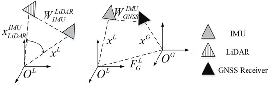 Constructing the time—space correlation of each sensor is a fundamental task in multi-sensor fusion optimization. For this system, it is necessary to spatially unify the positional estimation results of LiDAR and IMU in the local map with the GNSS measurements in the global map. Therefore, the spatial unification strategy of the multi-sensor pose involved in this paper is shown in Figure 5.