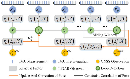 Considering the possible overlap of the moving vehicle driving areas, it is necessary to add a loop detection link to establish possible loop constraints between non-adjacent frames. According to Equation (5), the loop factors can be constructed as follows: