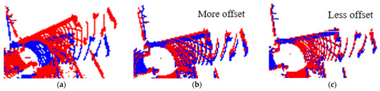 Compared with the typical indoor environment, for mobile carriers in complex urban environments, the angles and translations between the source and target point clouds during the continuous frame and the loopback detection may be larger. As shown in Figure 7, when the initial position is unreasonable, the registration results of the ICP algorithm cannot fully approach the global optimal solution, which is detrimental to both the local pose estimation and loopback correction of the mobile carrier. However, the registration accuracy of our algorithm is not affected by the large positional transformation of the vehicle platform. Compared with the traditional ICP algorithm, the registration result of our algorithm suited the needs of the vehicle platform better.