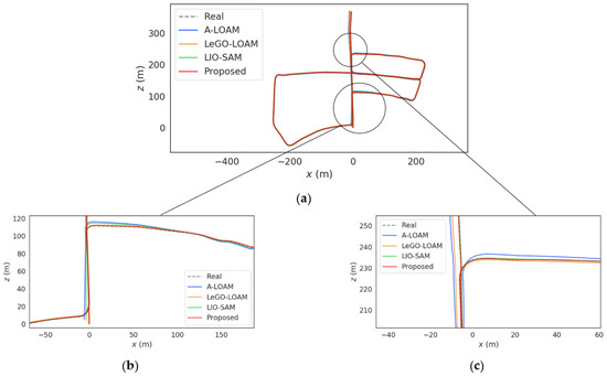 As shown in Figure 15c, the mapping trajectory of the algorithm proposed in this paper is basically fitted with the true value of the driving trajectory, and, in the loop road section in the lower right corner, the trajectories passing through the same landmark twice are basically coincident. The reasons are as follows: firstly, smoothing the point cloud clusters can improve the fault tolerance of the point cloud registration between the front and back frames; secondly, the weighted GNSS global constraint can eliminate the GNSS measurements with large observation gross errors, thus achieving superior mapping results.