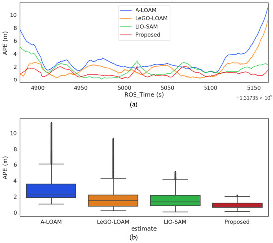 As can be seen from Figure 13a, firstly, due to the accurate registration of the front-end point cloud, the absolute trajectory error of Proposed(-) decreases slightly compared to the pre-improved system. In the initial parking section of the dataset, the traditional ICP algorithm suffers from the problem of over-iterations, and the result is not the global optimal solution. However, the data smoothing processing and the setting of the iteration termination threshold of our algorithm can solve this problem well, providing a better initial value for the positional matching. The absolute trajectory error within the first 25 s drops by approximately 8m compared to LIO-SAM. Secondly, compared to LIO-SAM, which uses GNSS observations directly as global constraints without filtering, we introduced GNSS confidence into the optimization equation. It allows our algorithm to remain unaffected by poor-quality GNSS observations and to maintain a better positioning accuracy in the latter 50 s in areas with dense tall buildings and poor-quality point cloud distribution. In contrast, due to the poor quality of GNSS observations involved in optimization (LIO-SAM) and the low accuracy of LiDAR loop detection as a global constraint (A-LOAM and LeGO-LOAM), all other similar algorithms have a cumulative increase in the absolute trajectory error with steeper slopes. This is extremely detrimental for vehicle-mounted platforms driving in realistic large outdoor environments. From the experimental results, it can be seen that the global optimization link in our complete algorithm can well suppress the local cumulative drift and make the pose estimation result move more towards the global optimal solution.