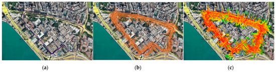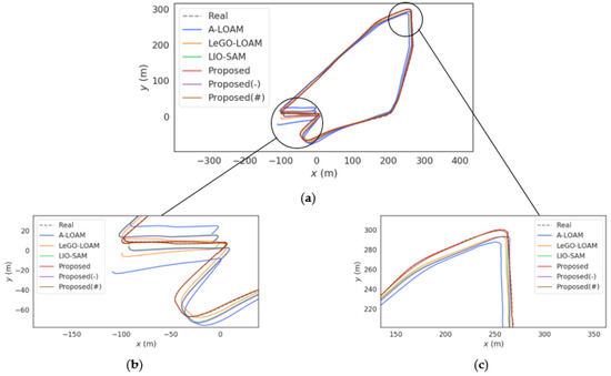To further investigate the extent to which improvements in both the front-end and back-end components of the fusion algorithm improve its positioning accuracy, we conducted ablation experiments in a complex environment of GNSS signals. We constructed a system without GNSS global correction (-), a system without smoothed voxelized point cloud registration and loopback correction (#) and a complete system (Proposed), respectively. The experimental environment is the complex reflection area of GNSS in the urban environment. The experimental platform includes: the ground truth, which is provided by NovAtel SPAN-CPT positioning results; the LiDAR point cloud, which is acquired by HDL 32E Velodyne LiDAR, where the horizontal field of view angle is , the vertical field of view angle range is and the scanning frequency is 10 Hz, which is suitable for in-vehicle point cloud data acquisition; IMU, which is Xsens Mti 10, and the update frequency of the pose is 100 Hz; the GNSS receiver, which is u-blox M8T, and the update frequency is 1 Hz.