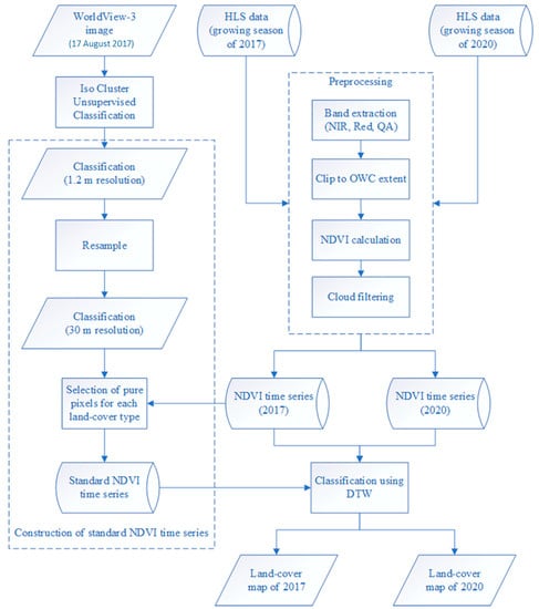 With these standard NDVI time series for each land-cover type, we used the Dynamic Time Warping (DTW) approach to calculate the similarity and distance between each HLS pixel in the dataset and the four standards. The Dynamic Time Warping algorithm was first introduced and explored in the field of speech recognition [36], but it was then applied in many other fields, including time series clustering specifically applied to land-use and land-cover mapping from remote sensing data [37]. DTW measures the similarity between time series and minimizes the effects of shifting and distortion over time. Particularly suitable to phenological time series, the approach by Maus et al. [37] can handle time series with different lengths. Considering that the length of the NDVI time series from different years can vary, DTW was selected in this study to measure the similarity between the time series to ensure that the standard NDVI time series built from one year can be applied to other years to conduct the classification. We classified the vegetation throughout the wetland during the growing season (May–September) of each year, 2016–2020. For each pixel, the land-cover that had the smallest distance was assigned to each HLS pixel as its dominant type. The complete process of classification using the NDVI time series from HLS is illustrated in Figure 2.