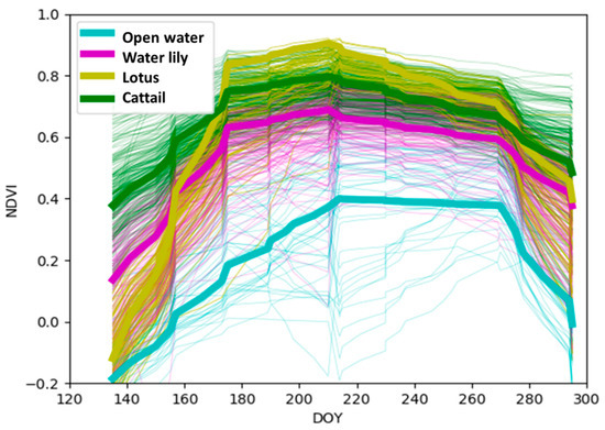 The time series of NDVI that we observed in the pure pixels defines each patch type (Figure 3). The differences between patch types provide some ecological insight with regard to their seasonal dynamics. The cattail and water lily classes show similar NDVI trends, except that the overall mean NDVI of cattail was higher than that of water lily. Lotus started growing later than cattail and water lily, but its spring green-up was faster, such that by around day the year (DOY) 175, its NDVI value exceeded that of cattail and stayed the highest among all the land-cover types. Its fall senescence started at about DOY 210, as with all the other types, but it showed the fastest browning rate, and, by around DOY 280, its NDVI became lower than that of cattail. Open water always showed the lowest mean NDVI value and followed a similar temporal NDVI trend to that of the vegetated land-cover types. We hypothesize that the reason for this similarity is that water pixels are rarely truly pure and almost always include some vegetation within the pixel.