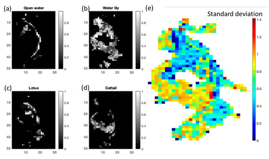 (a–d) Fractional cover. For each HLS pixel, the fractional cover indicates the fraction of pixels in the corresponding World-View3 image that are located within that HLS pixel area that are of the patch type that was classified as the HLS majority patch type (i.e., the classified HLS type of that pixel). Panels show results per HLS classified patch type (patch types are listed in panel titles). A fractional cover value of 1 indicates that all the area within the HLS pixel belongs to the classified patch type. A low fractional cover indicates that a large fraction of the area within the HLS pixel belongs to different patch types from the classified majority type. (a) Open water, (b) water lily, (c) lotus, (d) cattail. (e) Overall patch heterogeneity is represented as the standard deviation of patch types among the World-View3 pixels within each HLS pixel.