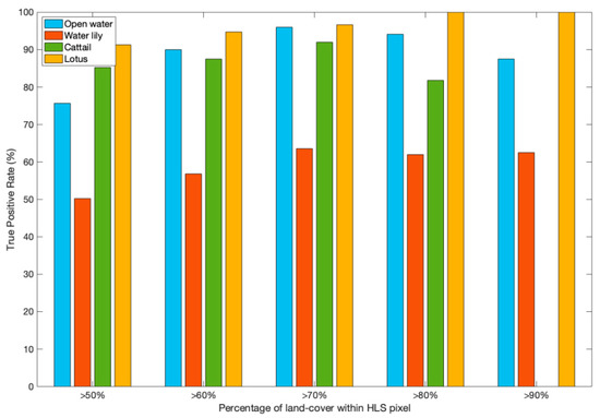 Many of the HLS pixels were heterogeneous and included a mixture of different patch types, with the classified patch type only contributing to a fraction of the full area of the pixel (Figure 4). In such cases, the classified patch type was assumed to represent the type that covered the largest fraction of the pixel area. Water lilies tended to grow in small patches, which resulted in highly mixed HLS pixels for the water lily patch type (Figure 4b). Furthermore, water lily leaves float on the surface of the water and are not truly emergent. As a result, the water lily classification accuracy, at 50–64%, was lower than that of the other patch types (Figure 5). Overall, for the three other patch types, when an HLS pixel covered an area that had more than 60% of a certain type of land cover, the overall accuracy was higher than 80% (Figure 5). The classification accuracy tended to increase when the fractional cover increased, which indicates that when a pixel is less mixed, it is more likely to be classified in the correct class.