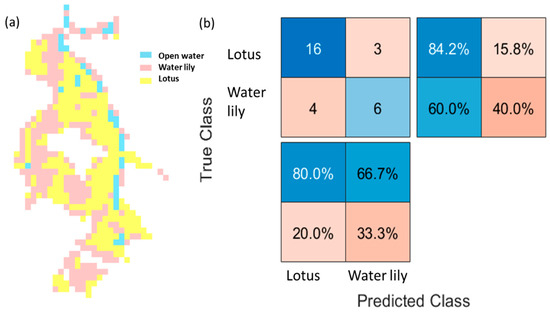 (a) HLS classification result of 2020. (b) A confusion matrix comparing the result with field survey points.