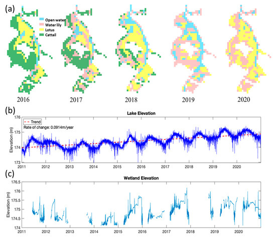 (a) Time sequence of patch location and extent in OWC, produced by the classification of HLS data from 2016 to 2020. (b) Rapid increases in Lake Erie’s water elevation over the last decade (data from NOAA, https://tidesandcurrents.noaa.gov/ (31 December 2021)) have led to (c) higher water levels in the OWC wetland area (data from NERR https://cdmo.baruch.sc.edu/ (31 December 2021)) and noticeable changes in the patch type composition. Cattail, which was the most common patch type by area in 2016, had disappeared and the floating-leaf patch type (lotus and water lily) coverage area grew; in recent years, these have become the most common by area.