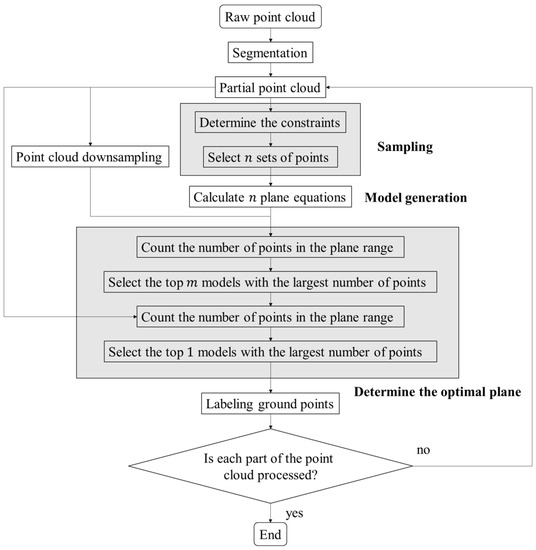 The flow chart is shown in Figure 2. First, the point cloud is observed and divided into several parts evenly according to the length and width. We determine the constraints and select n sets of points. n plane equation models are built, and the point cloud is downsampled. Then, we count the number of points within the range of each plane model, and select the top m models with the largest number of point clouds. The point cloud before downsampling is used to count the number of points within the plane model again. At this time, the selected plane model with the largest number of points is the optimal model. This process is repeated to obtain the ground model of the entire point cloud.