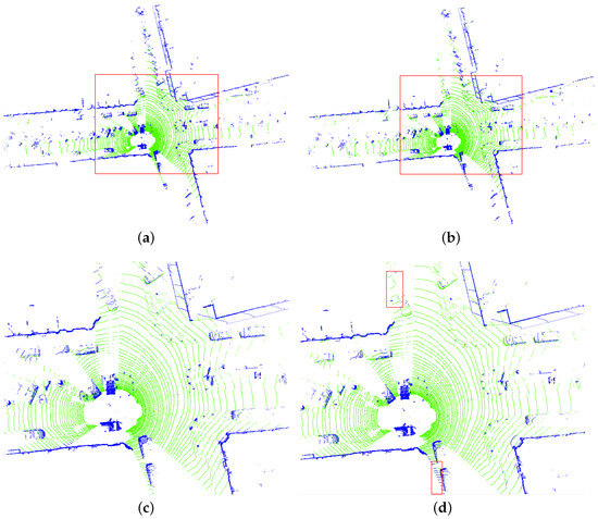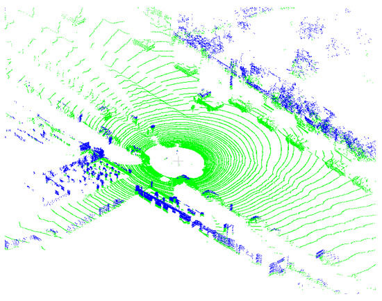 We select two point clouds in the KITTI data set. Both point clouds are road scenes with 110 k points. We manually label the point cloud. As shown in Figure 5a, the green points are ground points, and the blue points are non-ground points. The red frame marked area in Figure 5a is enlarged as shown in Figure 5c.