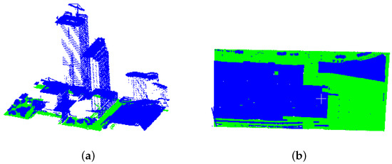 Figure 4. Special cases. The green points are ground points, and the blue points are non-ground points. (a) The number of points on the side of the building is greater than the points on the ground. (b) The number of points on the top of the building is greater than the points on the ground.