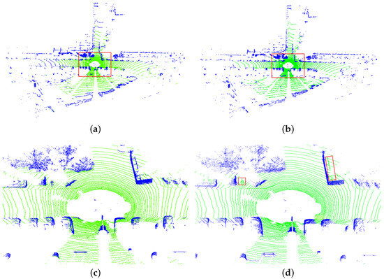We randomly select 20 point clouds in the KITTI dataset, manually annotate the ground and non-ground points, and record the number of ground and non-ground points. We found that the ground points account for about 40–60% of the entire point cloud. The computation time of the 3D-object detection method is related to the number of points in the point cloud. The lower the number of points in the point cloud, the lower the runtime. Therefore, the filtered point cloud can improve the speed of 3D-object detection. The times for the three object detection methods are shown in Table 4. It can be clearly seen that the detection time is significantly reduced. The results show that the proposed method does not have a large impact on the time of the 3D-object detection method.