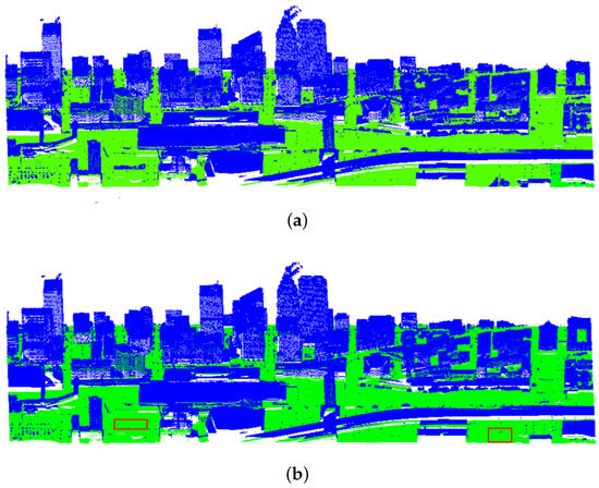 The result of the proposed method. (a) The point cloud manually labeled. (b) The point cloud processed by the proposed method. The red box area in (b) is classified incorrectly.