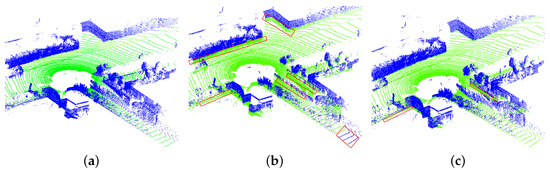 The results of the comparison between the method proposed in this article and the RANSAC plane fitting method. Green points are the ground points, blue points are the non-ground points. The red boxes in (b,c) are classified incorrectly. (a) The point cloud manually labeled. (b) The point cloud processed by the RANSAC. (c) The point cloud processed by the method proposed in this article.