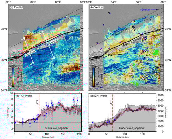 Figure 3b,d shows the cross-fault rate profile (PQ) in the ascending and descending InSAR rate maps. From the profile of PQ, there are obvious velocity gradients across the fault, and the LOS velocity difference is about 4–5 mm/yr. In the study area, the ATF is the major fault, whereas the velocity profiles also reflect the deformation of the Altyn North Margin fault (NATF) and Cherchen fault (CHEF). Such an effect may lead to an asymmetrical pattern in the velocity profiles. The ascending and descending velocity fields exhibit a clear transition, reflecting the left-lateral strike-slip fault motion.