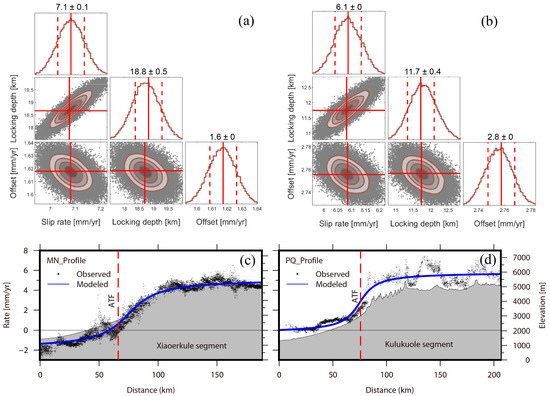 Probability distributions for profiles MN (a) and PQ (b). The red line and dot indicate the maximum a posteriori probability (MAP) solution from the Markov chain Monte Carlo (MCMC) analysis. We modeled fault-parallel velocity profiles along ATF, (c) for profile MN, and (d) for profile PQ. The profile’s location is shown in Figure 4. The red dashed lines are the fault location of ATF.