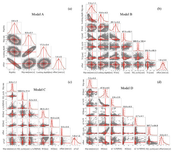 Model C is still a viscoelastic model adopted in [107]. The difference is that different effective elastic layer thicknesses on both sides of the fault are considered. To reduce the number of parameters in the inversion, the locking depth is fixed as the results from Model B and no longer participates in inversion because of the trade-off between fault slip rate and locking depth. We assume that the Tarim Basin and the TP have different effective elastic thickness and shear modulus, respectively, and other prior conditions are the same as Model B to inverse the difference in elastic layer thickness and shear modulus ratio on both sides of the fault.